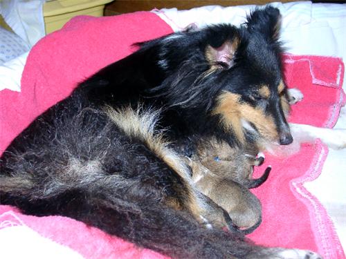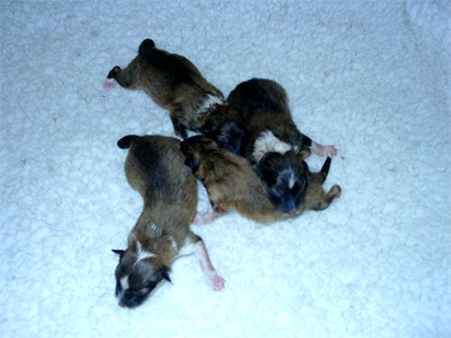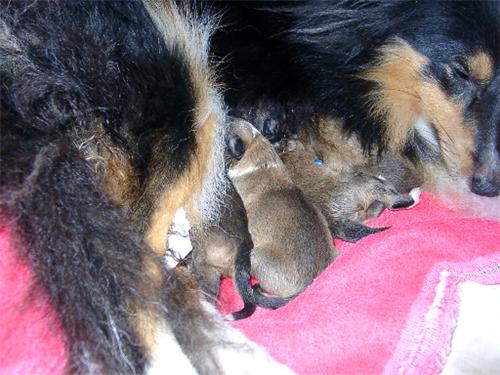 Mutter Eyla (Eyla vom Erkelenzer Land ) .. .. . Welpen ca. 2.Std. alt 3 zobelweiße Rüden 1 zobelweiße Hündin