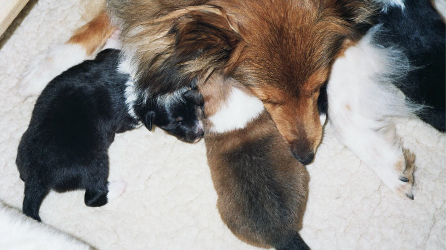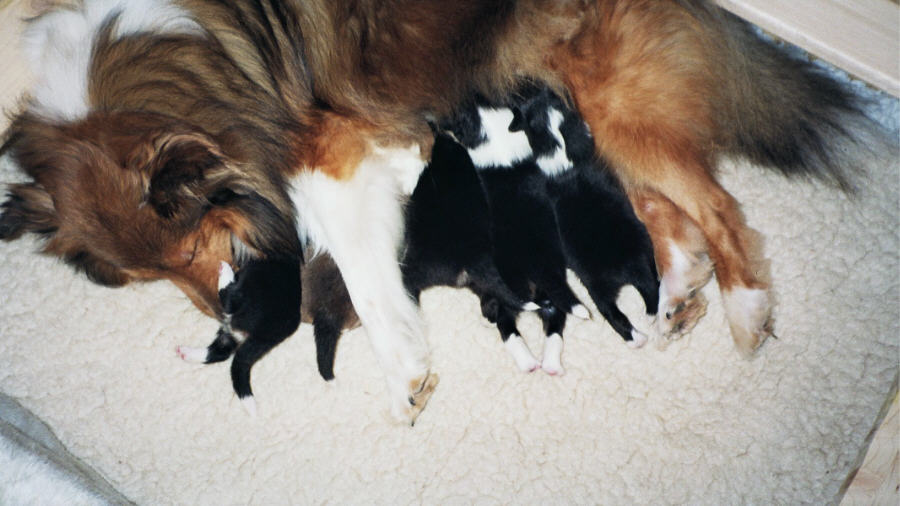 eine zufriedene und glückliche Mutter und ebenso ihre Welpen